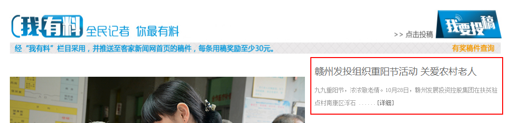 10月28日,《客家新聞網》“我有料”欄目刊發集團重陽節關愛農村老人宣傳報道。
