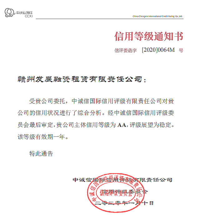 日前,經中誠信國際信用評級有限責任公司信用評審委員會審定,評定贛州發(fā)展融資租賃有限責任公司(下稱“贛發(fā)租賃”)主體信用等級為AA,評級展望為穩(wěn)定。這是贛發(fā)租賃成立以來的首次外部評級,也是江西省首家融資租賃企業(yè)獲此評級的國企,標志著權威評級機構對贛發(fā)租賃綜合實力的認可。