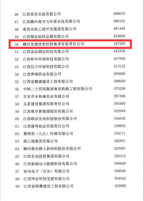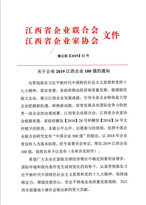 日前,江西省企業聯合會、江西省企業家協會發布了“江西企業100強”榜單,集團榮列2019江西企業100強榜單第50位。