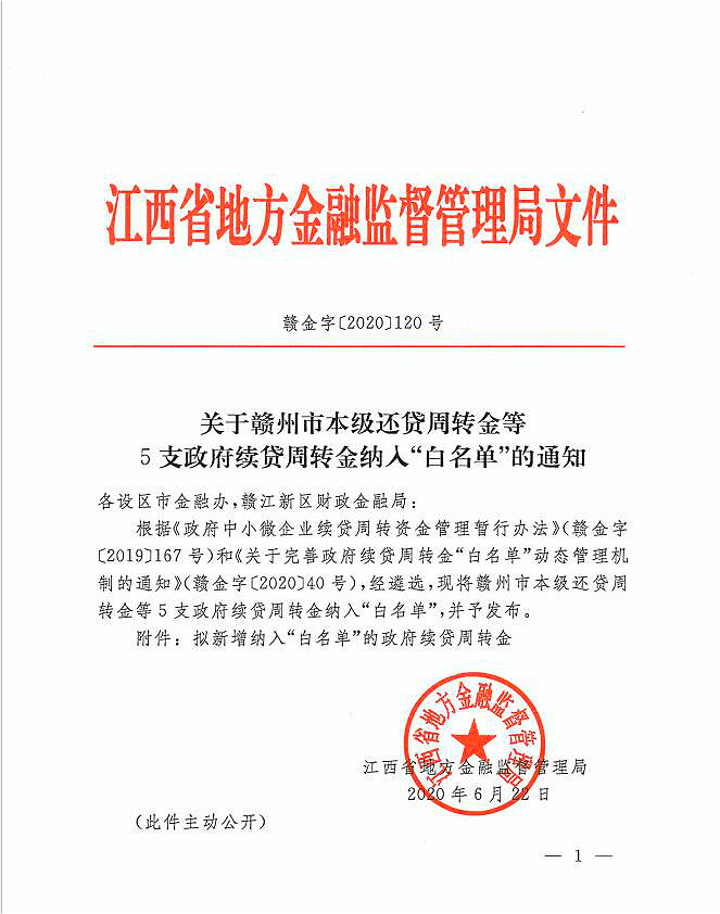 近日,江西省地方金融監督管理局下發《關于贛州市本級還貸周轉金等5支政府續貸周轉金納入“白名單”的通知》,同意贛州發展企業還貸周轉金公司納入政府續貸周轉金“白名單”。