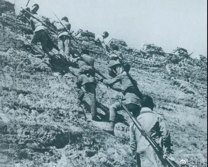 1945年6月25日,八路軍冀中部隊攻克河北獻縣。圖為部隊奮勇攀登城墻。