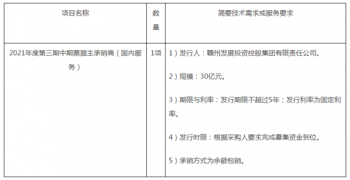 項目名稱:贛州發展投資控股集團有限責任公司采購2021年度第三期中期票據主承銷商項目