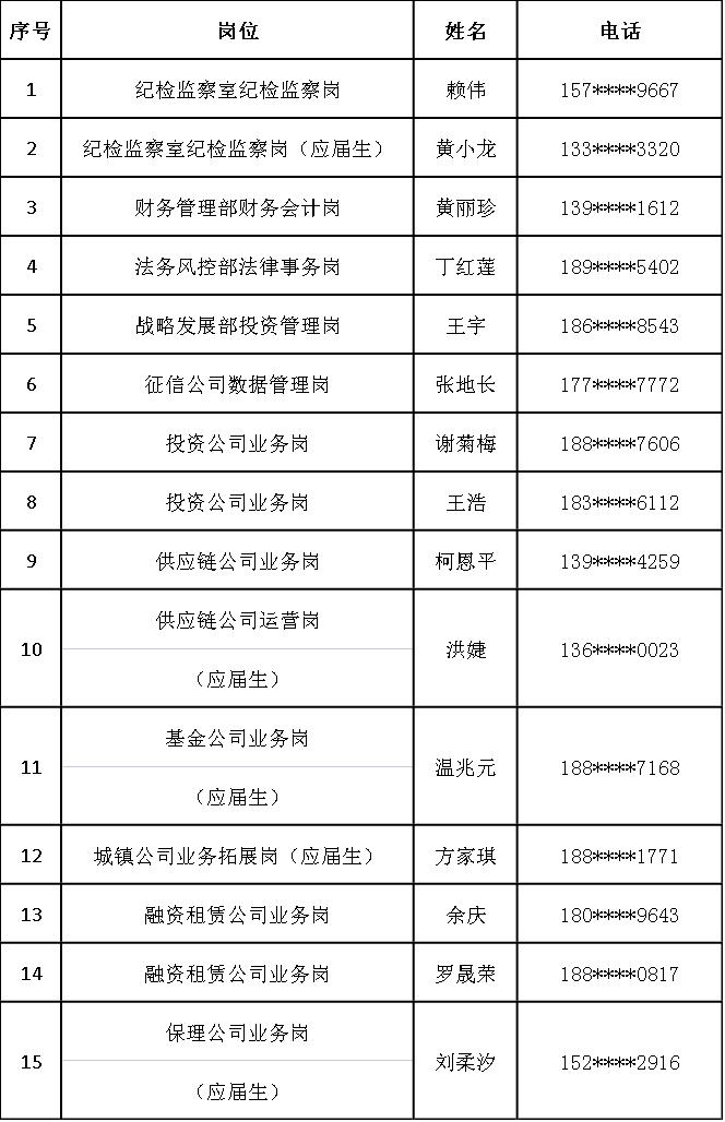 根據(jù)《贛州發(fā)展投資控股集團公開招聘公告》要求,通過公開報名、簡歷初審、資格審查、筆試、面試(其中研究生單獨兩輪面試)、體檢與背調等程序,經(jīng)研究,確定以下15名同志為擬錄用人員,現(xiàn)予以公示: