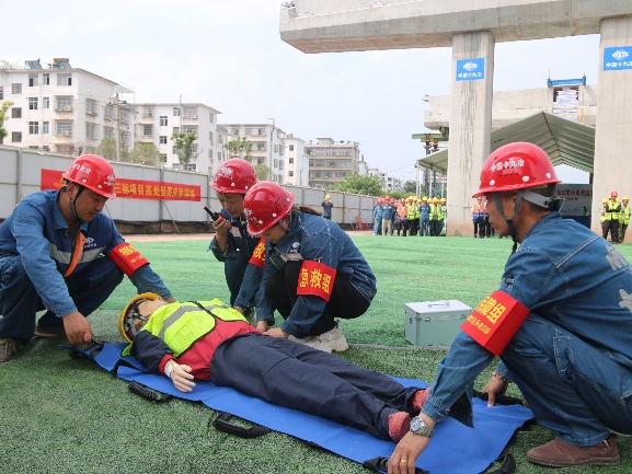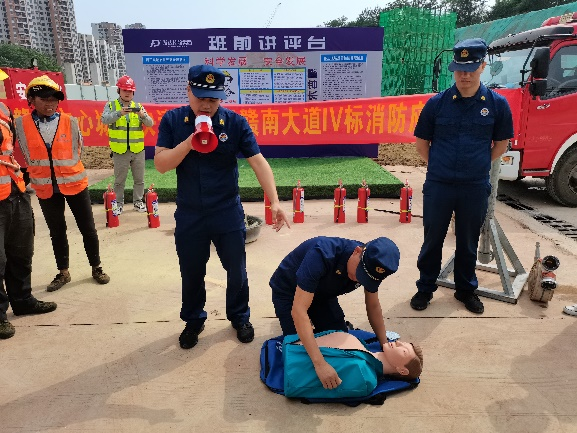 贛州市中心城區(qū)快速路工程—贛南大道Ⅲ標(biāo)、贛南大道Ⅳ標(biāo)蓉江段、東江源大道快速化改造工程項(xiàng)目現(xiàn)場(chǎng)根據(jù)快速路施工特點(diǎn)和潛在的各類風(fēng)險(xiǎn)隱患,有針對(duì)性地分別開(kāi)展了快速路施工高處墜落、物體打擊、高溫中暑等事故應(yīng)急救援和消防應(yīng)急演練活動(dòng),并邀請(qǐng)了贛州市消防救援大隊(duì)教官和人民醫(yī)院醫(yī)護(hù)人員進(jìn)行現(xiàn)場(chǎng)急救教學(xué)。
