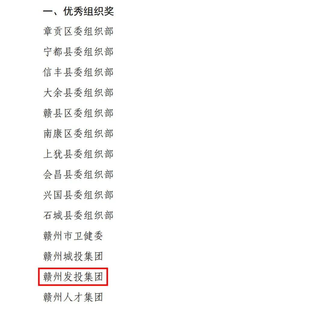 6月4日,贛州市委人才工作領導小組公布了《關于2023年度贛州市優秀人才工作案例、優秀人才創新創業短視頻評選結果的通報》,贛州發投集團榮獲全市“優秀組織獎”、優秀人才工作案例、人才創新創業短視頻三等獎。