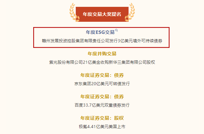 此次提名,既是對贛州發展集團作為贛南經濟核心平臺戰略地位與資信實力的高度認可,更是對集團“穩健財務+綠色轉型”雙輪驅動模式的全球點贊。作為境內唯一入圍“年度ESG交易”獎項提名的企業,集團用實力證明地方國企能夠能以專業化、國際化的資本運作,在全球信用市場中精準把握機遇,為區域經濟注入動能。未來,集團將持續以合規為基、以創新為翼,深耕可持續金融實踐,讓“贛州樣板”在國際舞臺綻放更多光彩,為革命老區高質量發展再添新功!