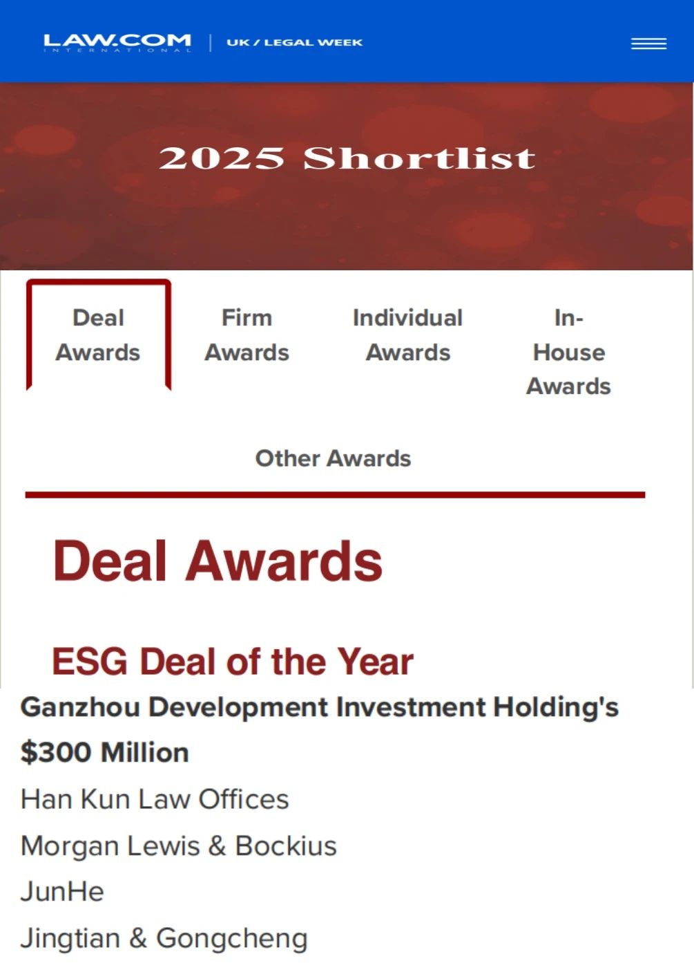 近日,國際知名法律媒體Law.com International公布2025年度亞洲法律大獎提名名單,贛州發展投資控股集團有限責任公司3億美元可持續發展境外債券項目強勢入圍“年度交易大獎”子獎項“年度ESG交易”獎項提名,成為境內唯一獲得該獎項提名的企業,以“可持續發展”鮮明屬性,彰顯集團在ESG實踐與國際資本運作中的雙重突破。