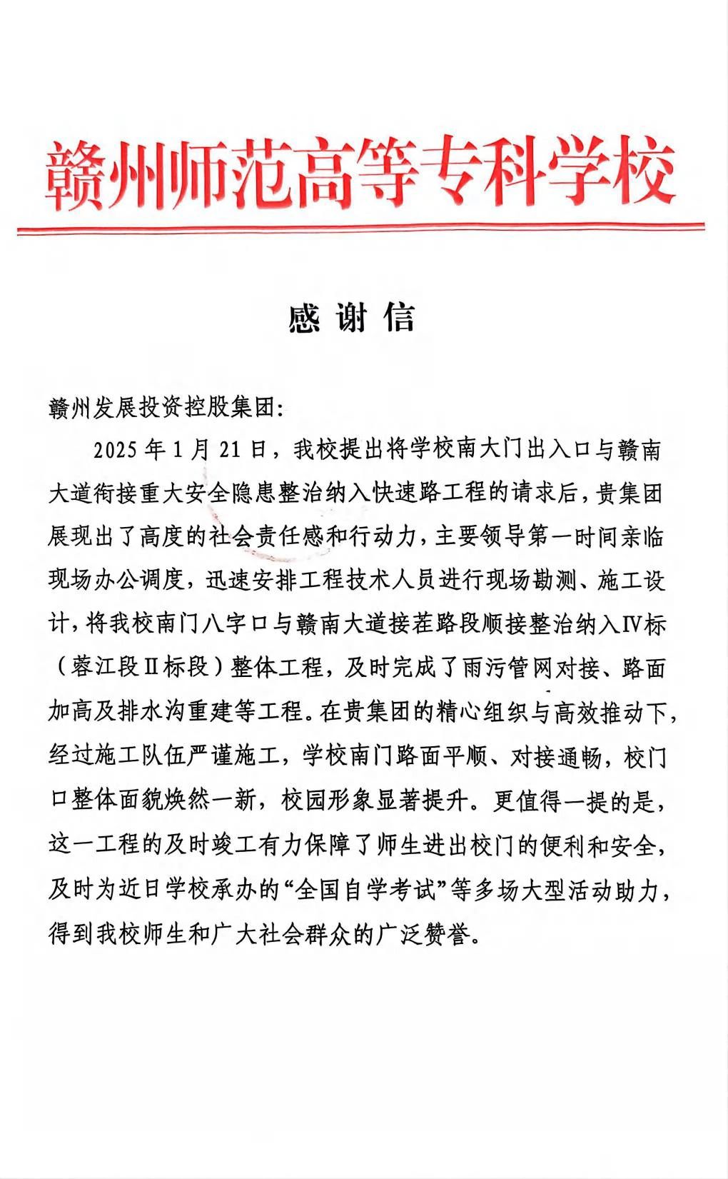 此前,該校南大門出入口與贛南大道銜接處的高差問題,成了師生出行的“心頭患”。城鎮(zhèn)公司得知后,秉持“如我在訪”中“群眾之事無小事”的態(tài)度,迅速聯(lián)動(dòng)設(shè)計(jì)、施工單位多次現(xiàn)場(chǎng)辦公,為徹底消除隱患,把銜接改造納入贛南大道相關(guān)標(biāo)段建設(shè),有序推進(jìn)雨污管網(wǎng)順接、路面加高、排水溝重建等工作。如今,這里的路面平順銜接,每日保障8000余名師生安全出行,也為學(xué)校承辦大型活動(dòng)鋪平了道路,校方特地發(fā)來感謝信表達(dá)謝意。