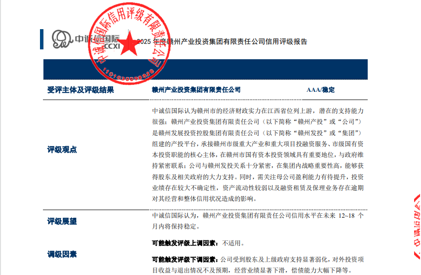 近日,中誠信國際信用評級有限責任公司正式授予贛州產業投資集團有限責任公司AAA主體信用等級。這是繼2024年12月30日獲評東方金誠國際信用評估有限公司AAA評級后,贛州產投集團在短期內再次獲得國內權威評級機構AAA最高信用評級。成為江西省首家獲得“雙AAA”主體信用評級的產業投資集團,亦是中誠信在江西省評定的首家AAA級產業投資集團。
