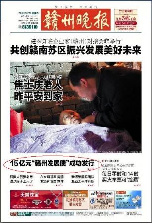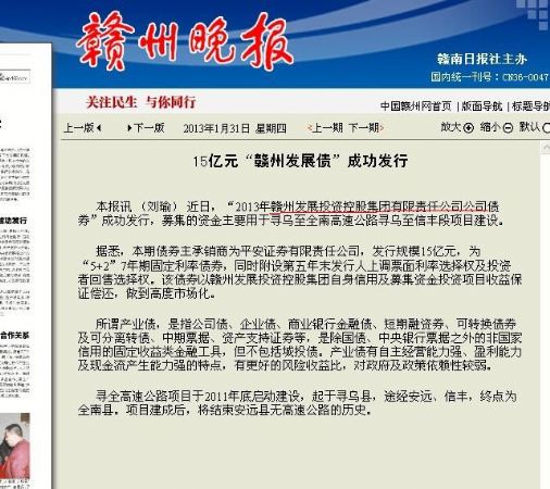 1月31日,《贛州晚報》以《15億元“贛州發展債”成功發行》為題報道了我公司最新融資成果,詳細介紹了“13贛州發展債”的發行情況、發行規模、資金用途、發行意義等,在社會引起了廣泛關注。